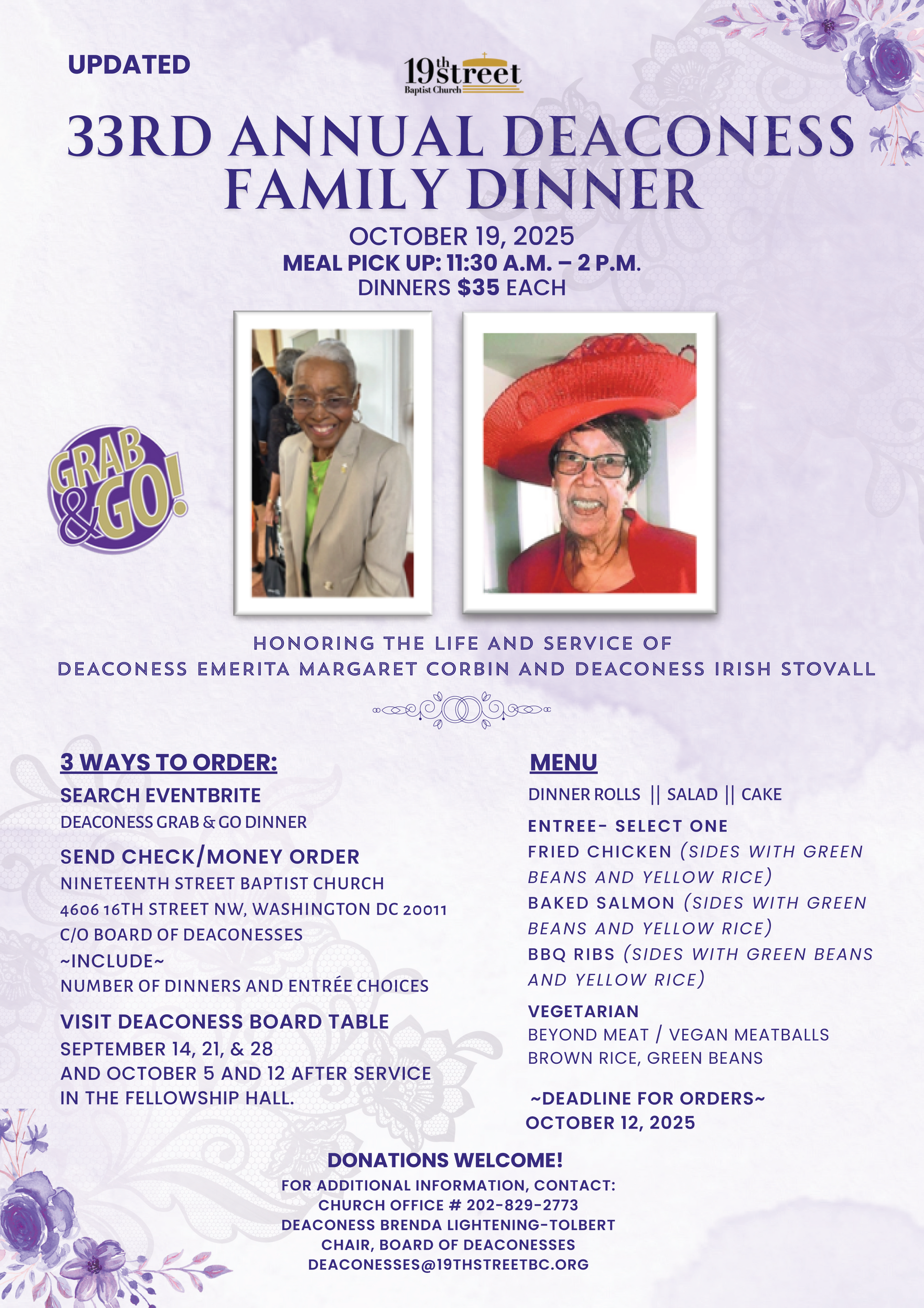The Board of Deaconesses will be hosting the 33rd Annual Deaconess Family Dinner, its fifth Grab & Go style event, on Sunday, October 19. This year, we honor the life and service of Deaconess Emerita Margaret Corbin and Deaconess Irish Stovall.