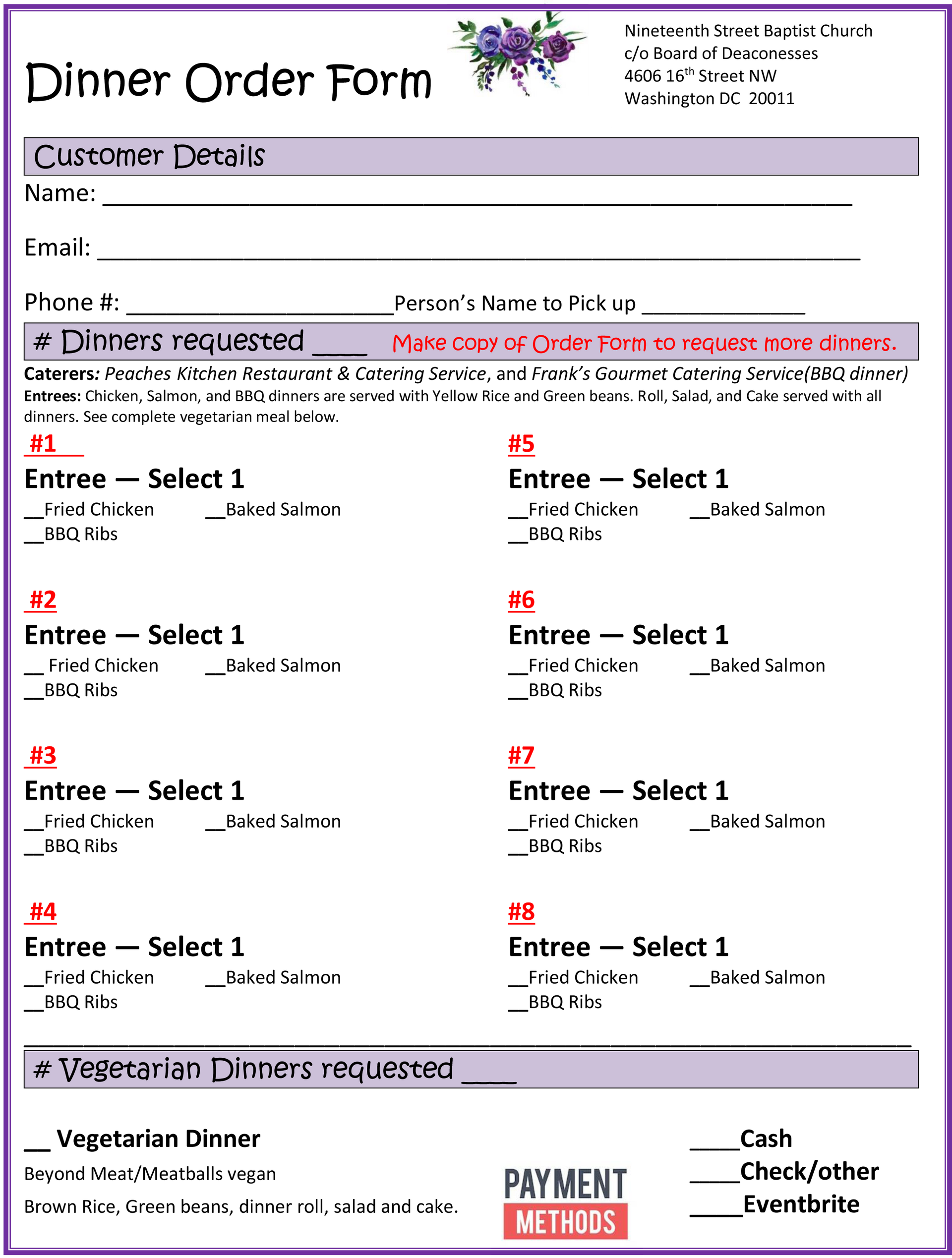 Meal orders will be taken in advance, beginning Sunday, September 14 through Saturday, October 12. Dinners are $35 each. Pick-up will take place in the fellowship hall from 11:30 a.m. to 2 p.m. For details and to place an order, go to our Eventbrite page.