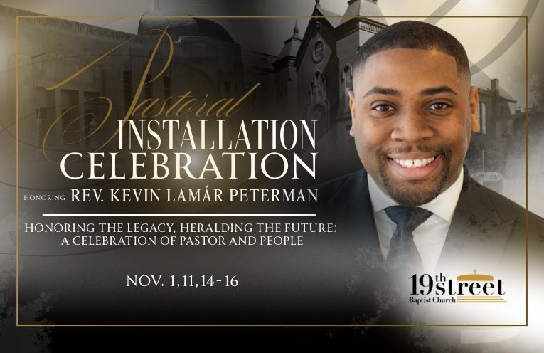Gather with the Nineteenth Street congregation for the formal installation service of our new pastor, Rev. Kevin Lamár Peterman. The service will be led by guest minister Rev. Lawrence E. Aker III, Lead Pastor of Cornerstone Baptist Church in Brooklyn, N.Y. This sacred service honors the covenant between pastor and people and marks a new beginning—Honoring the Legacy, Heralding the Future: A Celebration of Pastor and People.